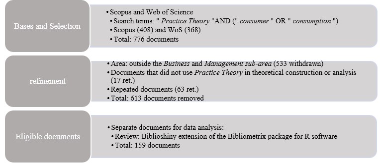 For the selection of studies within the databases, we initially sought to separate the studies within the area of business (business) and management (management). Subsequently, the following search terms were adopted: "Practice Theory" AND ("consumer" OR "consumption"). The use of practice theory as the main theoretical framework for the proposed analysis was also taken into account. As exposed by Isboli (2019), there is not a single “theory” of practice, but a set of theories of practice for understanding social phenomena (Bourdieu, 1977; Giddens, 1984; Reckwitz, 2002; Schatzki, 2002; Shove, Pantzar & Watson, 2012). The other focus of the study is to understand how practice theory has been adopted in studies on consumption and consumer behavior (WARDE, 2005, 2016). Thus, we sought to use the terms consumer or consumption as a way of selecting documents published internationally in English.